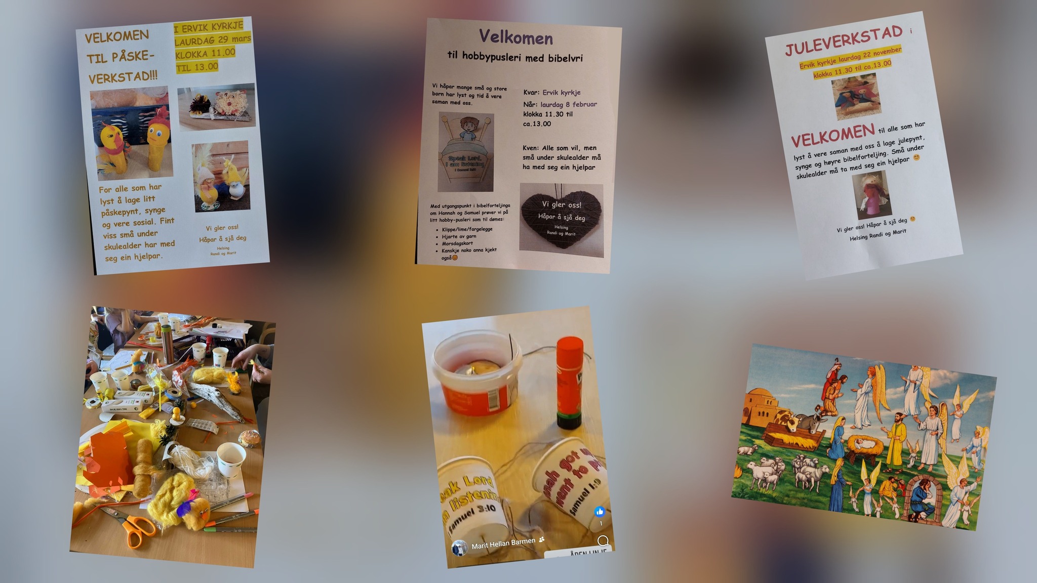 Her samlar dei ca ti vaksne og 20 barn i Ervik kyrkje til bibelforteljing, song, leik, mat og mange ulike kreative aktivitetar. Flanellografen er populær, og borna har stor glede av å flytte figurane rundt! Takk til alle som driv frivillig arbeid for born og unge og gir den kristne trua vidare til neste generasjon!